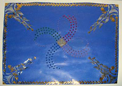 На фоне темно-сине-фиолетого цвета серебрянные вкрапления, символизирующие подобие ночного звездного неба.