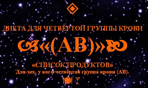 В наборе продуктов для людей с четвёртой группой крови (АВ) отражается их «смешанное происхождение» - наличие генов, определяющих и антиген А и В. Поэтому большенство продуктов, которые противопоказаны людям с группами крови А и В, противопоказаны и носителям крови АВ. В то же время существуют и исключения: ко многим продуктам люди с группой крови АВ более терпимы (например к томатам).
