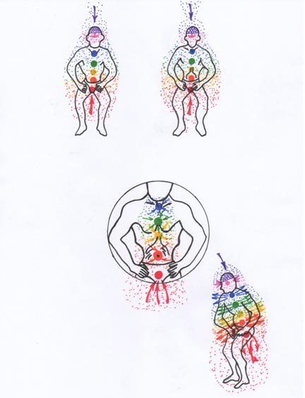 Наиболее активные чакры (1, 2, 3) во время выдоха и втягивания мышц живота переднии конусы этих чакр закрываются за счёт чего происходит стимуляция и восстановление работы чакр. А во время раслабления живота, резким движением происходит открытие конусов чакр, что в свою очередь ведёт к мощьной стимуляции работы чакр и их восстановления.